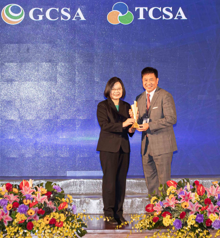 友達(dá)勇奪臺(tái)灣永續(xù)企業(yè)獎(jiǎng) 13 項(xiàng)大獎(jiǎng),由總統(tǒng)蔡英文頒獎(jiǎng) (左),友達(dá)董事長彭雙浪 (右) 代表領(lǐng)獎(jiǎng)